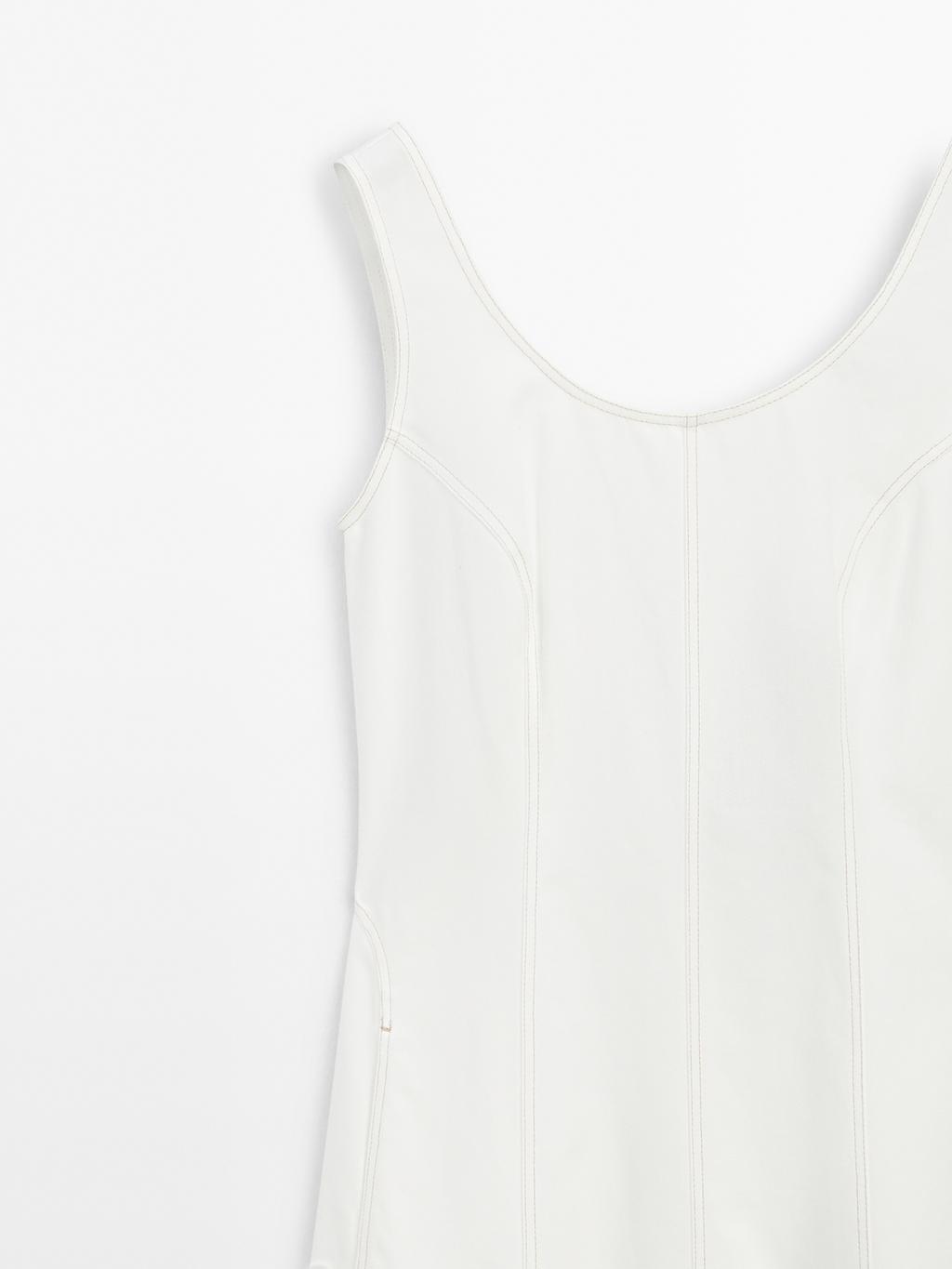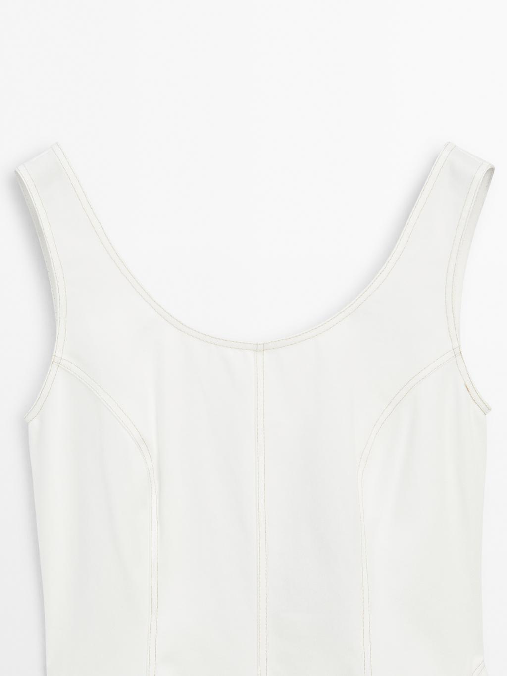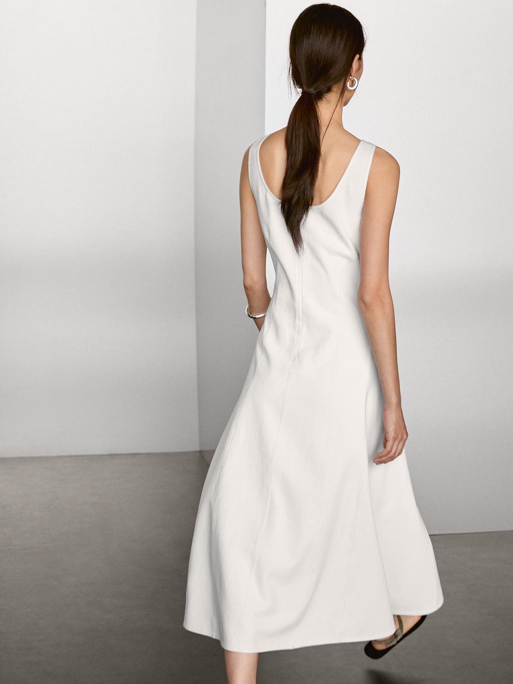 Denim midi dress made of 100% cotton fabric. Round front and back neckline. Sleeveless. Zip fastening at the back. Two side pockets. Seam details .