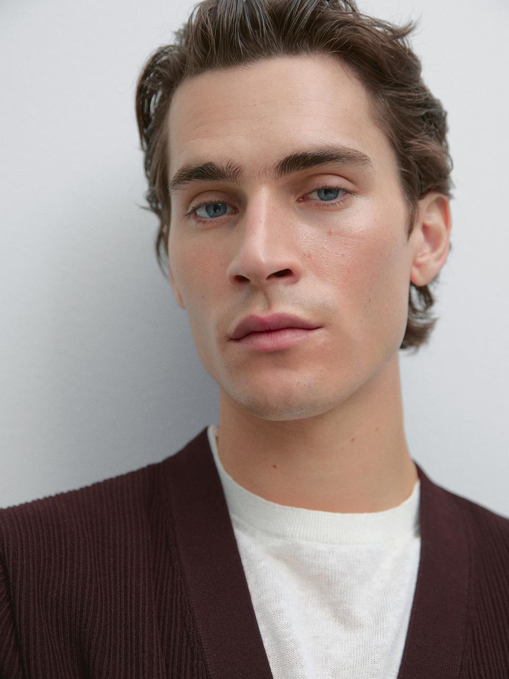 Cardigan made of knitted fabric with 100% cotton. V-neck. Long sleeves. Button-up front. Ribbed trims.