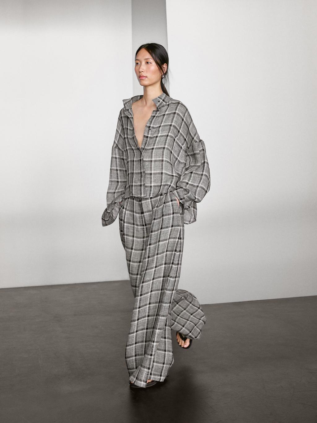 Shirt made of 100% linen. Long sleeves with buttoned cuffs. High neck. Fastens with snap buttons. Matching garment available. Wide and relaxed silhouette, not tailored.
