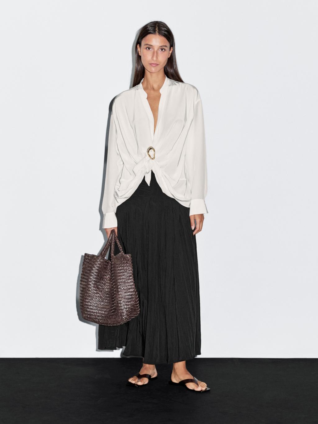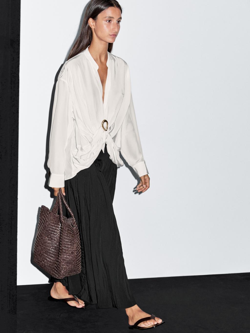 Flowing blouse with long sleeves. Stand-up collar with V-neck. Buttoned cuffs. Knot detail . Includes safety pin clasp.