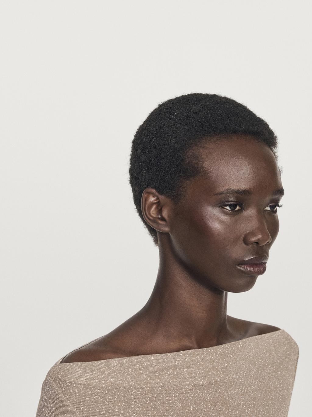 Long sleeve T-shirt. Slightly fitted silhouette, providing a more defined and slim appearance. Boat neck. Metallic thread.