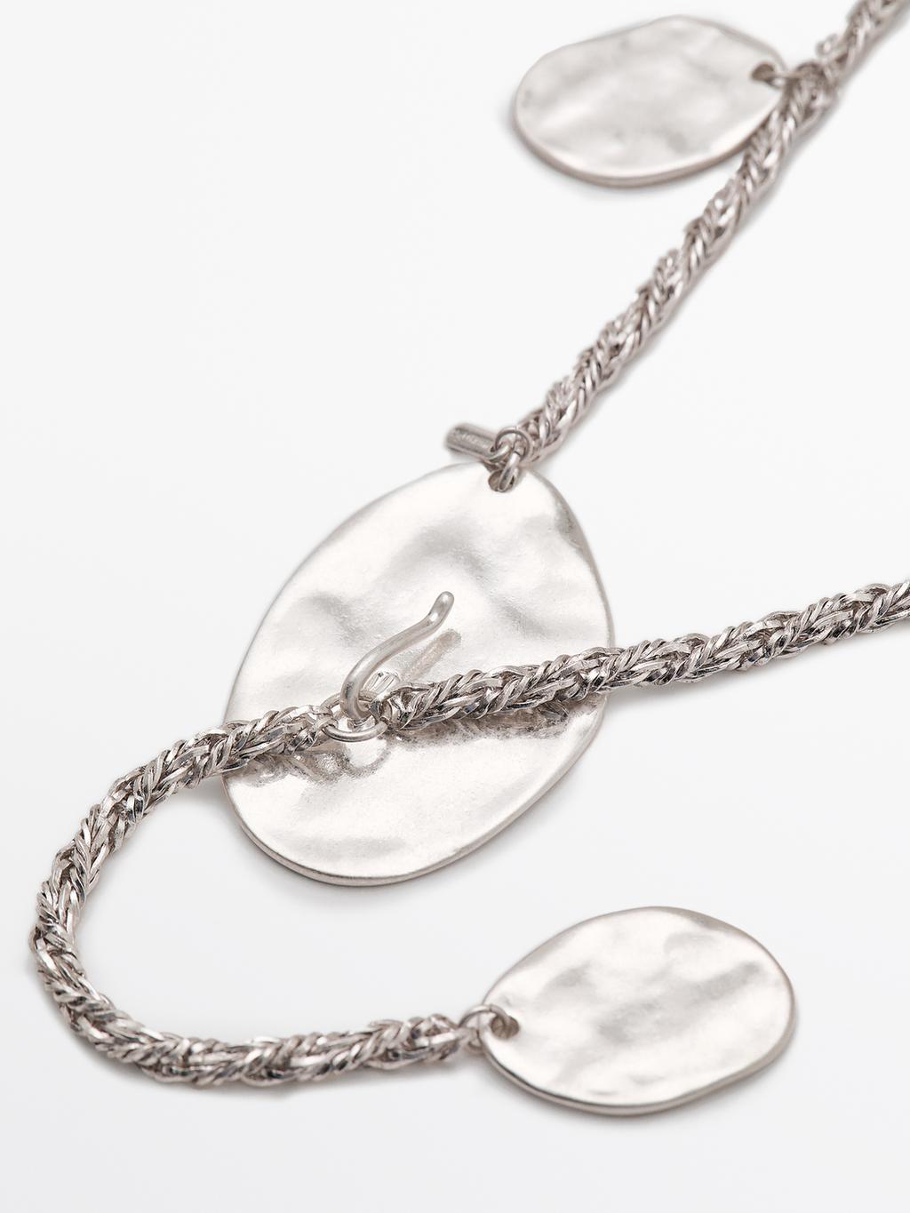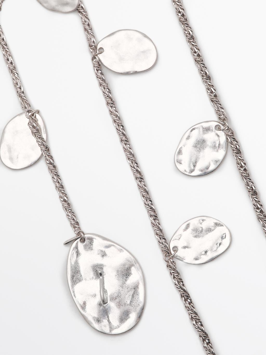 Plaited metal belt. Metal pendants with irregular coin design. Hook fastening . Total length: 110 cm.