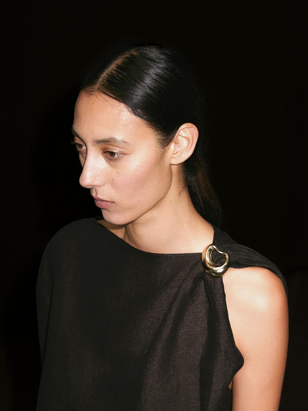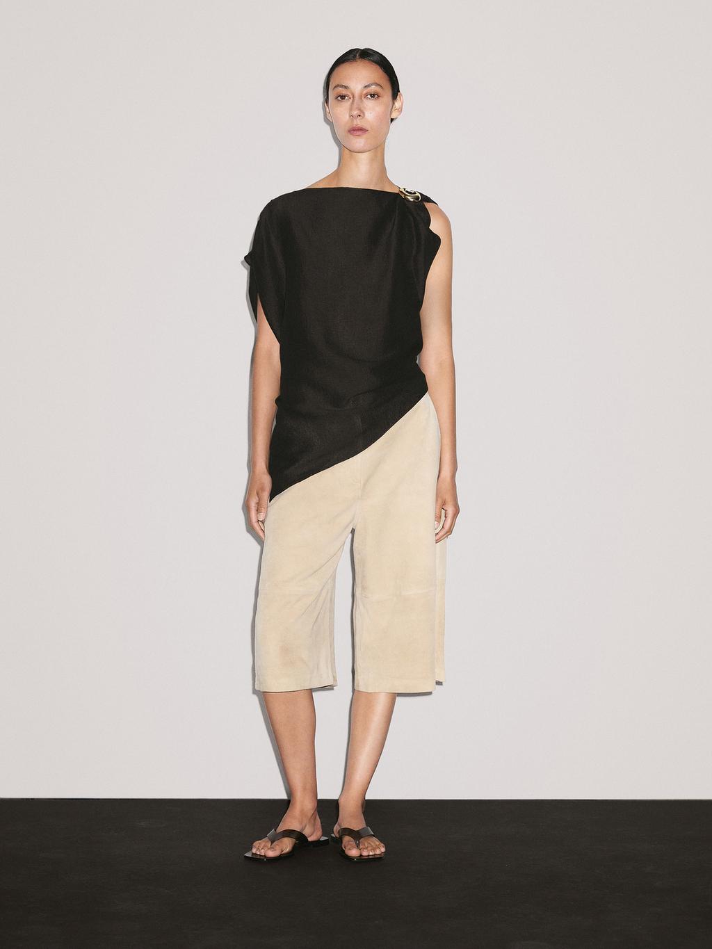 Flowing blouse made of a linen blend. Draped neckline. Sleeveless. Detachable metal clasp detail. Wide and relaxed silhouette, not tailored.